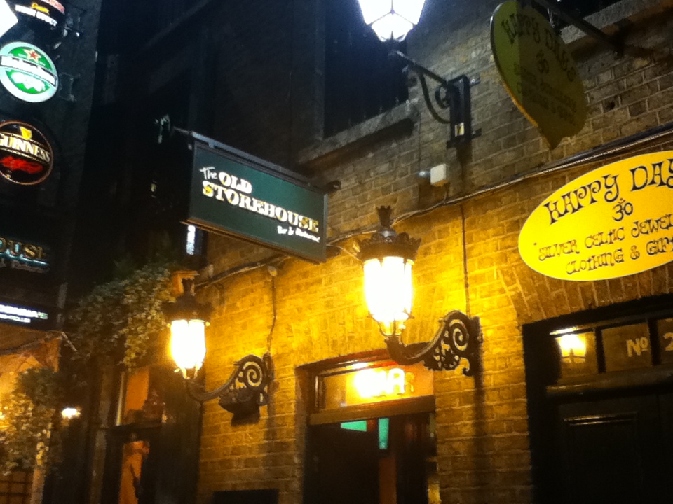 Do Mercantile, o pessoal do evento partiu a pé, cantando e fazendo barulho para outro pub, o Old Storehouse. Lá, recebemos um shot de alguma bebida irish que não me lembro o nome, mas que me lembrou Amarula. Ficamos nesse pub por algum tempo nos divertindo MUITO ao som de uma trio que cantava música celta. Diferente do Brasil, o povo aqui faz maior algazarra no bar e ninguém olha feio. Todos levantam, cantam e dançam loucamente.