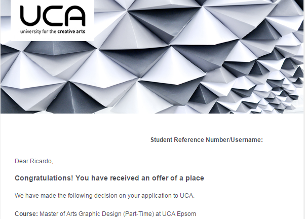 A primeira faculdade que me contatou foi a UCA (University of the Creative Arts), de Londres, que disse que, antes de tomar uma decisão na minha aplicação, precisava confimar o meu “fee status“.