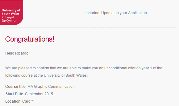 A USW (University of South Wales), de Cardiff, também disse que, antes de me fazer uma oferta, precisava confirmar o meu fee status e para isso, eles precisavam de alguns documentos. Mandei os documentos solicitados e fiquei esperando uma resposta sobre a decisão do meu fee.
