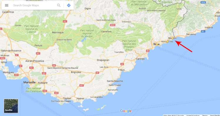 De Madrid, segui viagem para a parte mais relaxada dessa viagem, Menton, cidade localizada na Côte d’Azur, regiao francesa conhecida também como a Riviera francesa. Menton fica bem pertinho da Itália, como voces podem ver no mapa abaixo, e assim como toda a Côte d’Azur, é banhada pelo Mar Mediterraneo.