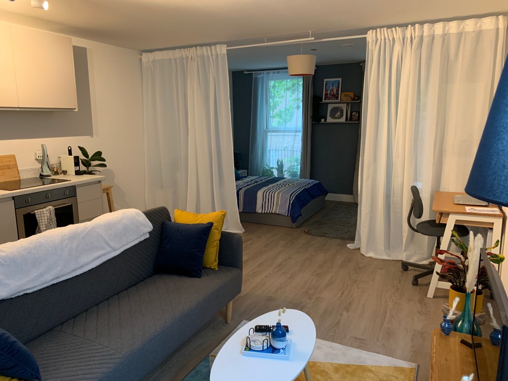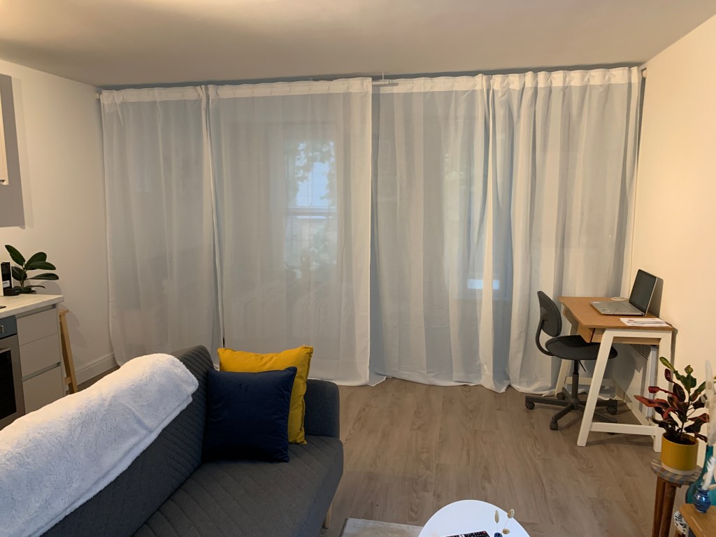 É um apartamento studio, ou seja, tudo fica no mesmo cômodo (tirando o banheiro, claro). Me inspirei bastante no Pinterest e criei áreas bem separadas no apartamento e também coloquei cortinas no meio, pra criar uma ilusão de separação entre quarto e sala/cozinha. Estou bastante feliz com o resultado.