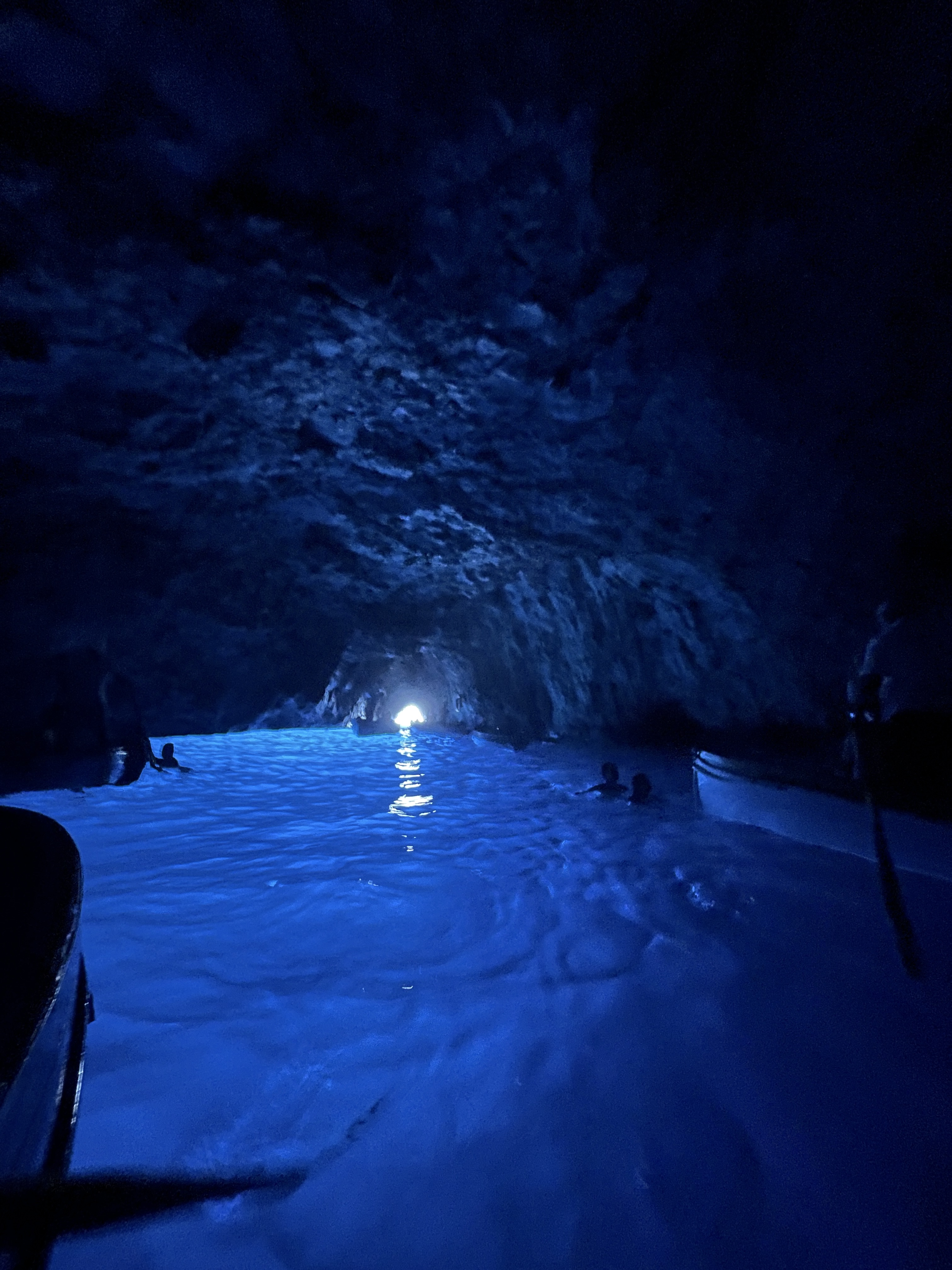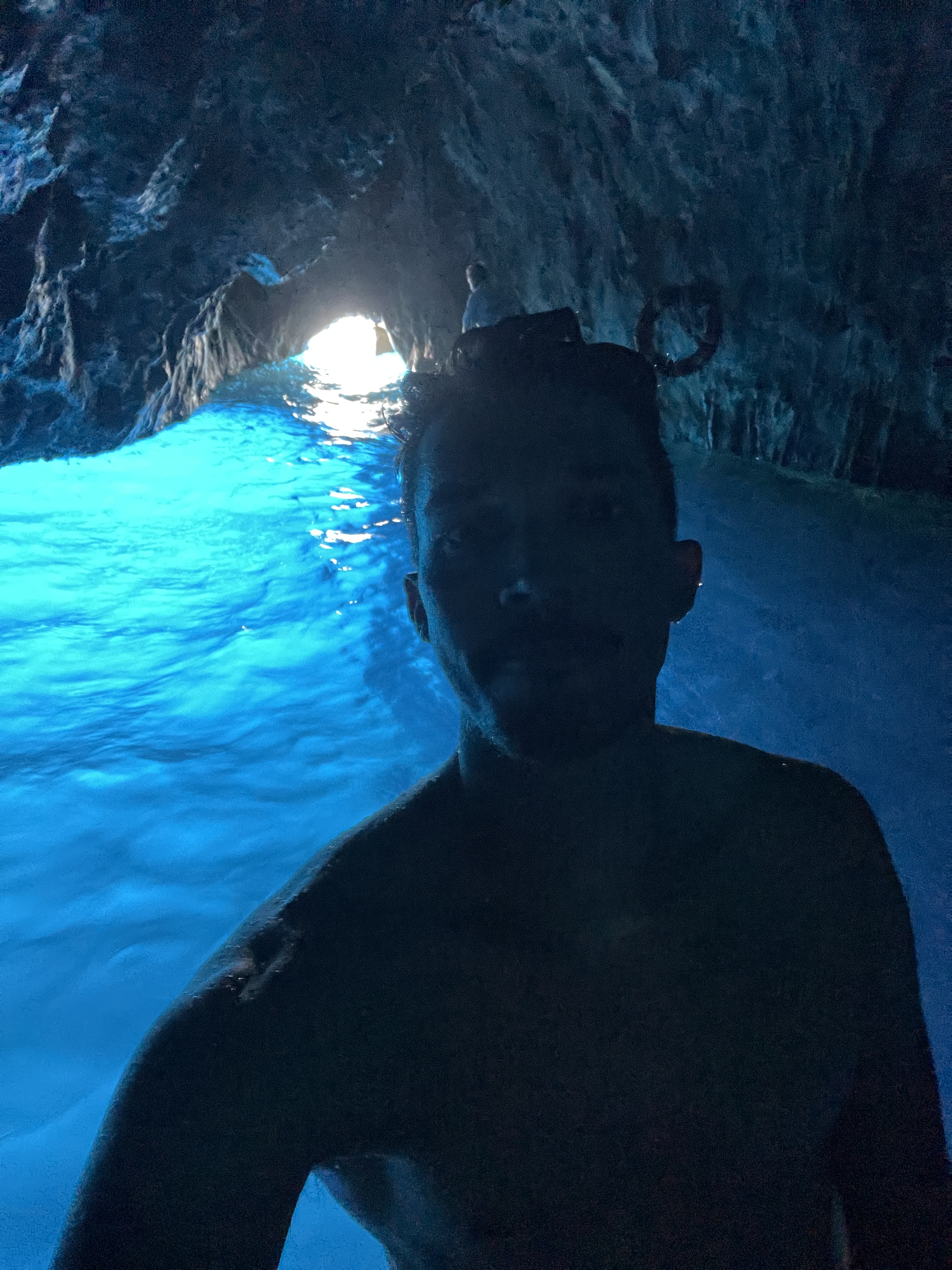 Já na Grota Azurra, que fica perto do final do passeio, o barco para e a gente espera pra poder entrar, pois só se pode entrar na gruta com uns barquinhos a remo minúsculos. Esperamos por aproximadamente 1h20, debaixo de um sol de 37c mas olha, valeu a pena!