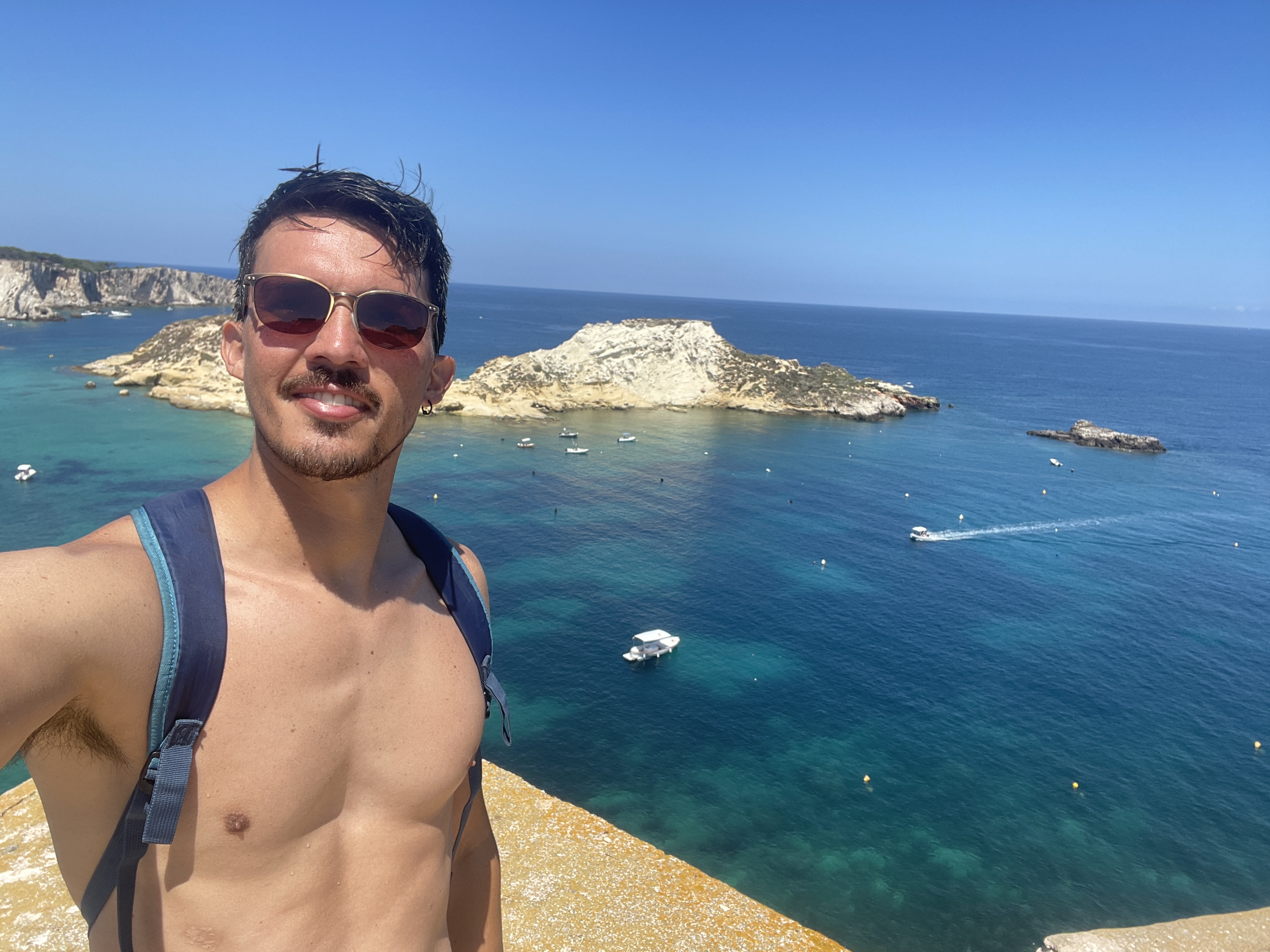 Depois do passeio, fui andar pelas diversas trilhas nas ilhas e toda vez que encontrava uma cala, que são as piscinas naturais formadas entre as rochas das ilhas, fui dar um mergulho. Acabei também nadado entre a ilha de San Nicola e Cretaccio, que ficam bem próximas.