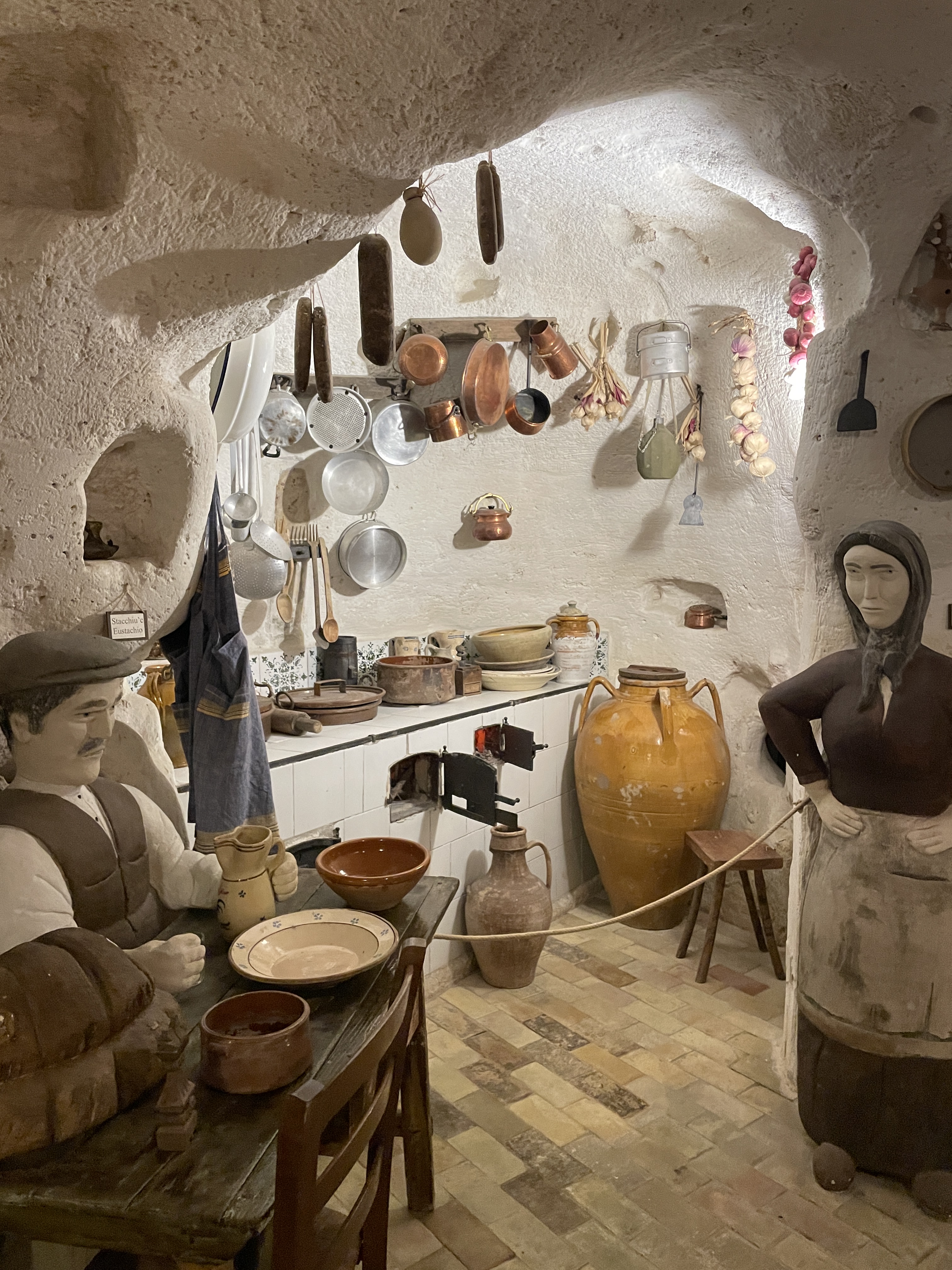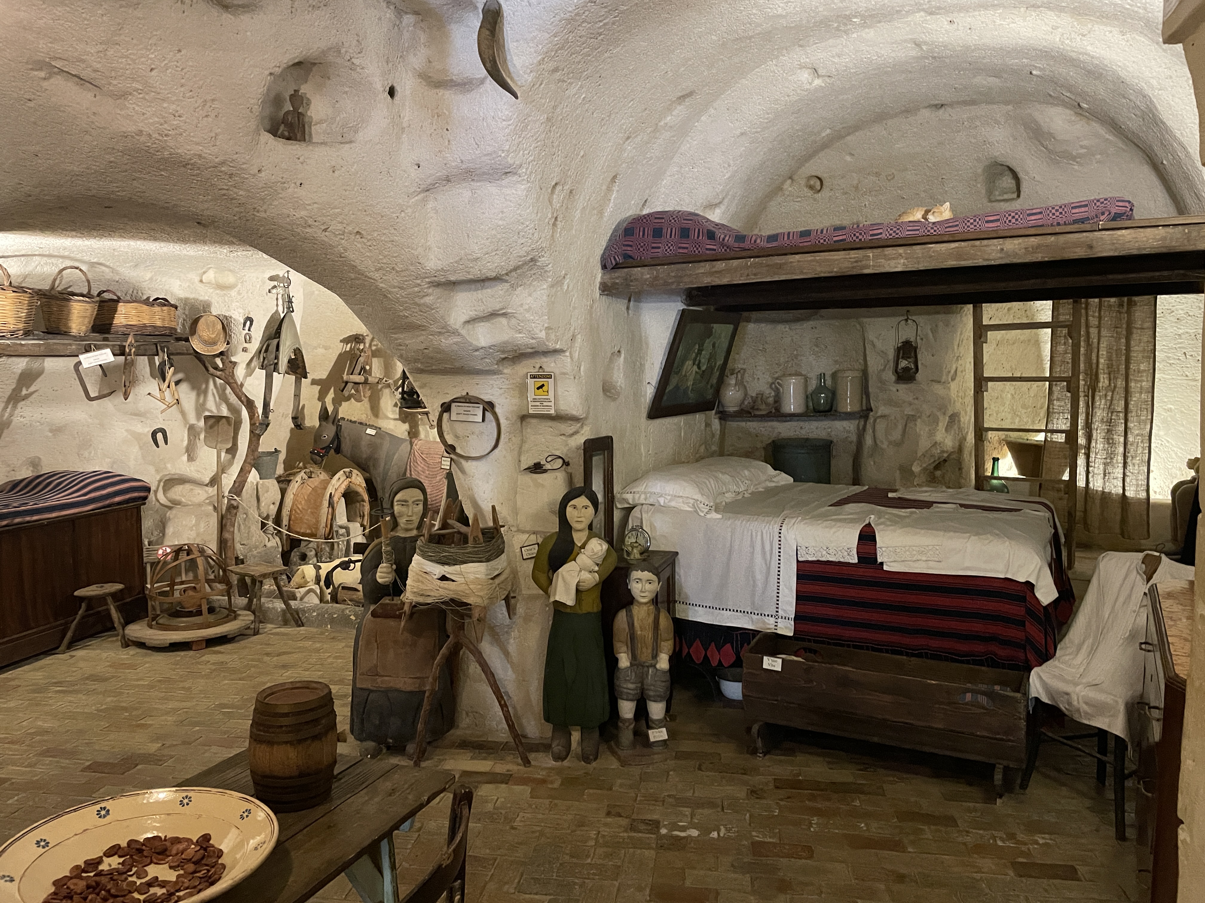 O Sassi de Matera é na verdade um vilarejo milenar que cresceu dentro das cavernas das montanhas da região. Por milhares de anos, os habitantes do Sassi viviam dentro dessas cavernas, que se misturam com as rochas da montanha. As casa só tem uma entrada, a porta principal, e o os três cômodos (quarto, cozinha, estábulo) são dividos entre humanos e animais.