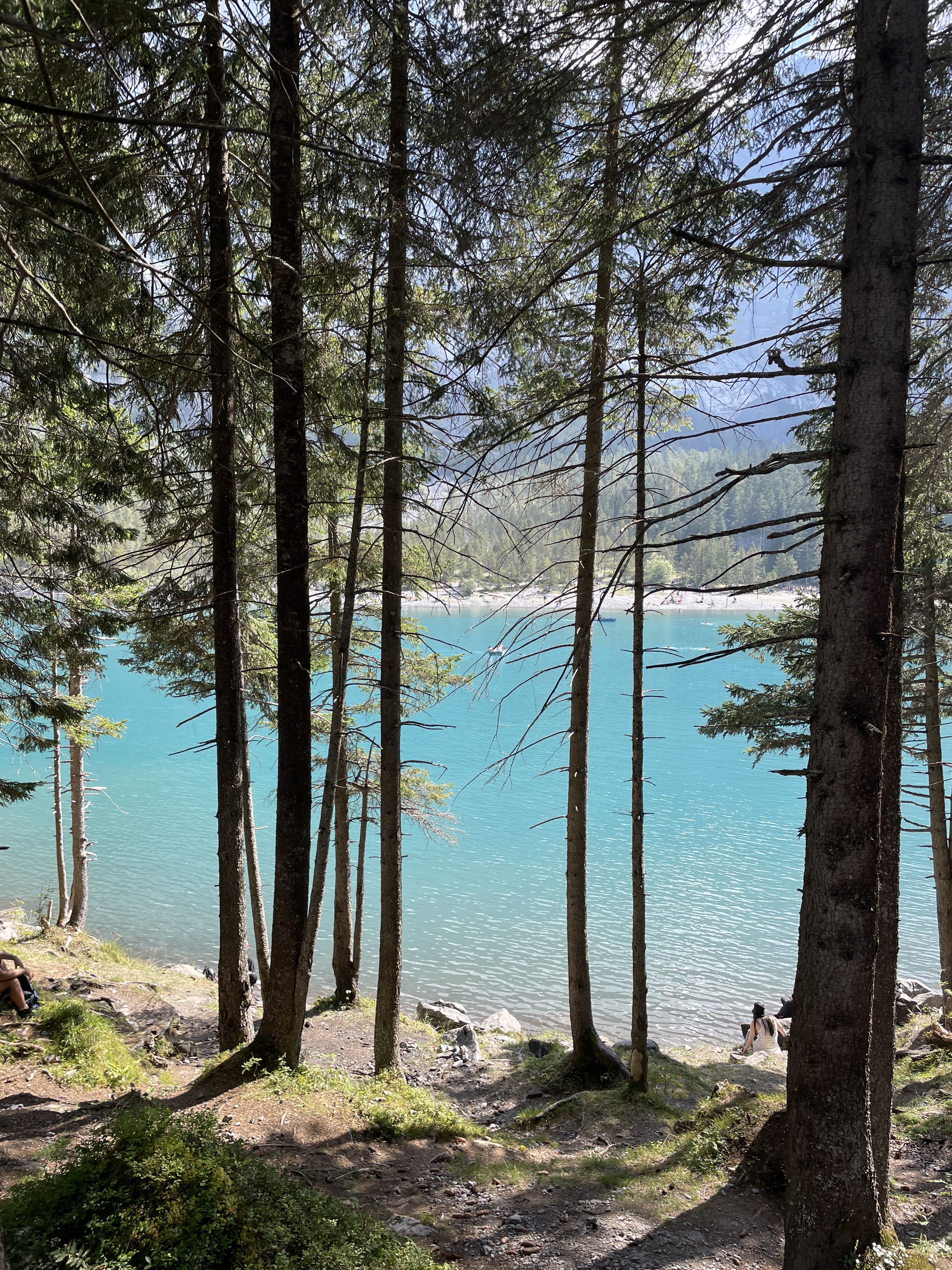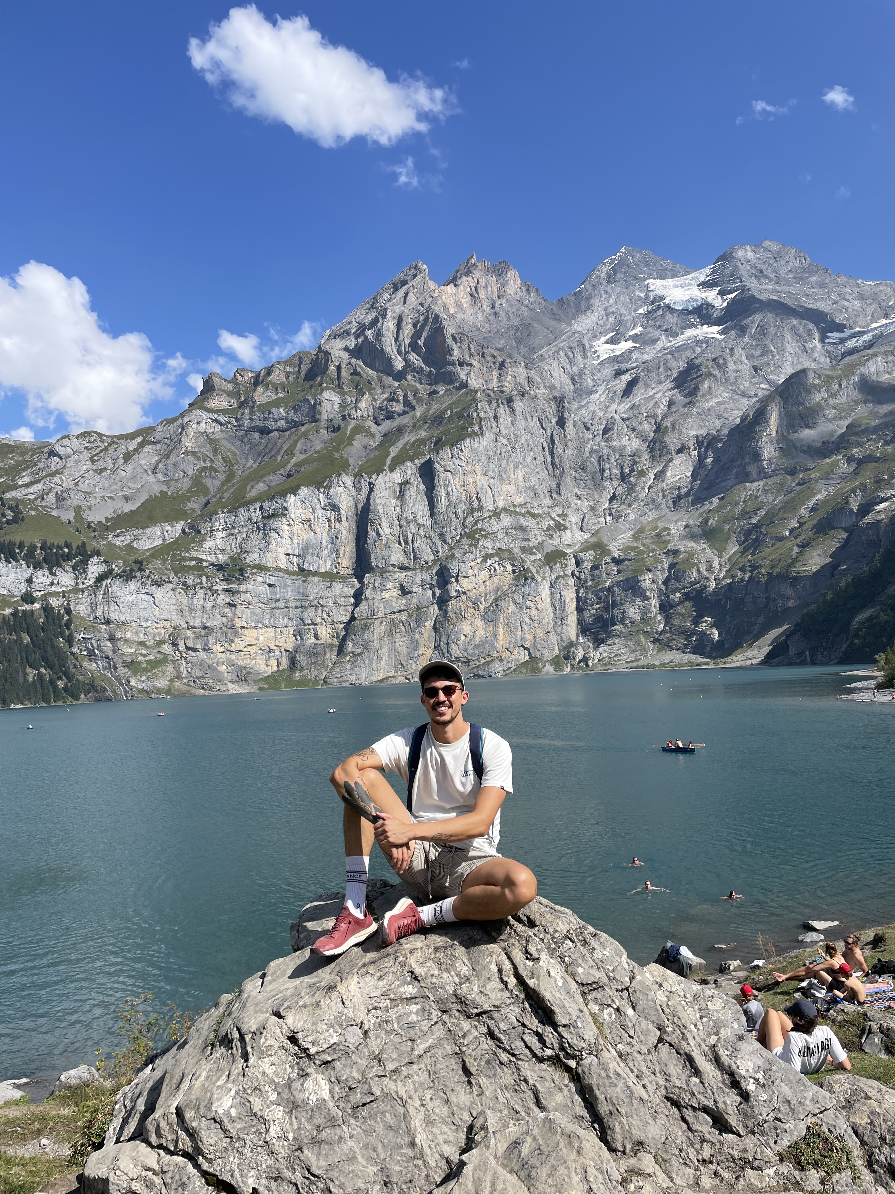 O tempo esta quente, coisa de 29 graus, porém, como estávamos no meio dos Alpes, ainda tinha neve no topo das montanhas e a água do lago glacial estava, como todo lago glacial, super gelada! Eu estava todo suado e com calor, resolvi pular na água. Entrei, sentí milhares de faquinhas entrarem na minha pele, e saí da água rapidinho!