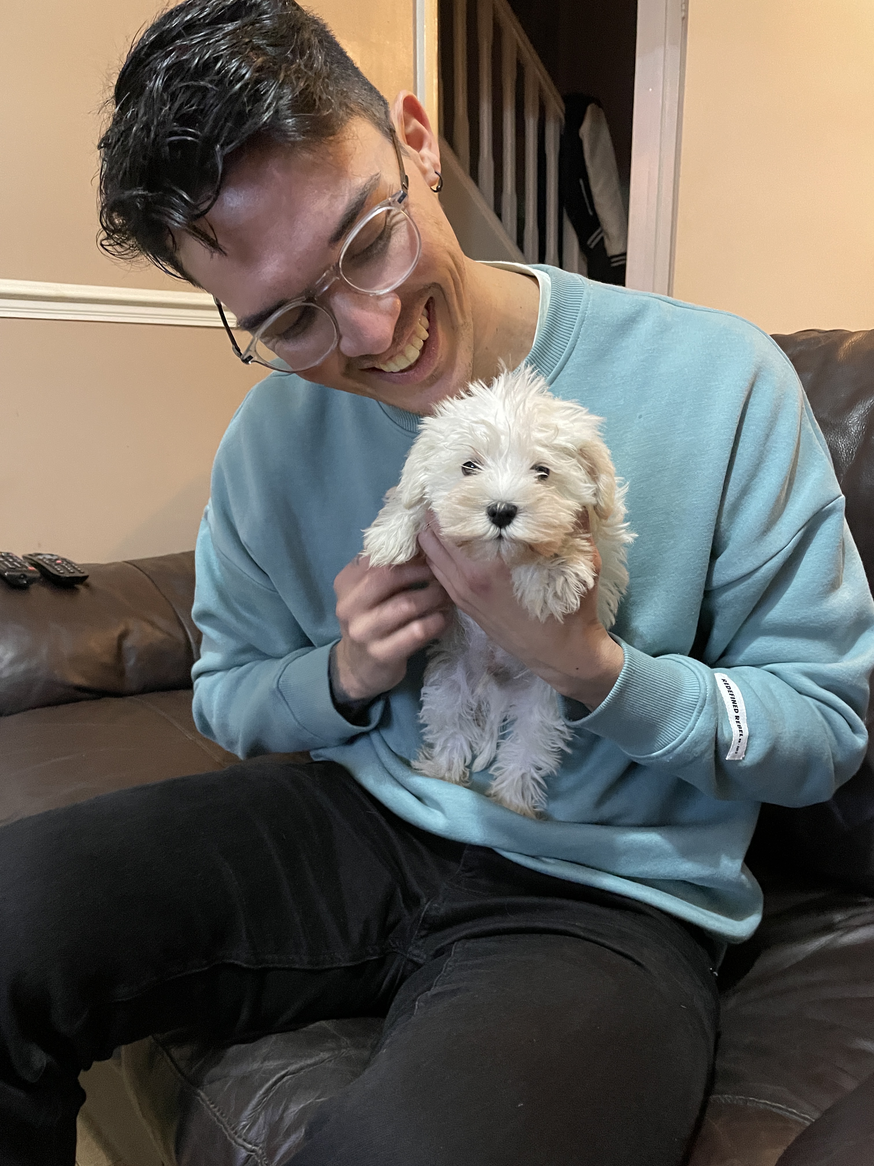 Decidi ali na hora que ele era o cachorro que eu queria e já acertei todos os detalhes pra adotá-lo. Ele poderia vir pra casa comigo a partir do dia 21/12, com 8 semanas, mas como eu tinha passagens para o Brasil, concordei com a família de deixá-lo com eles até eu voltar do Brasil.