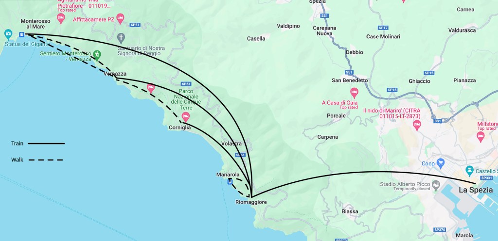 A maioria das pessoas visita de norte pra sul, mas eu resolvi ir de sul pra norte, começando em Riomaggioree terminando em Monterosso. O plano era caminhar entre todas as vilas, mas não de uma vez só. Ficamos hospedados estrategicamente em Riomaggiore e em Monterosso, e abusamos do Cinque Terre Train Pass, que permite pegar qualquer trem, qualquer hora entre as cinco vilas.