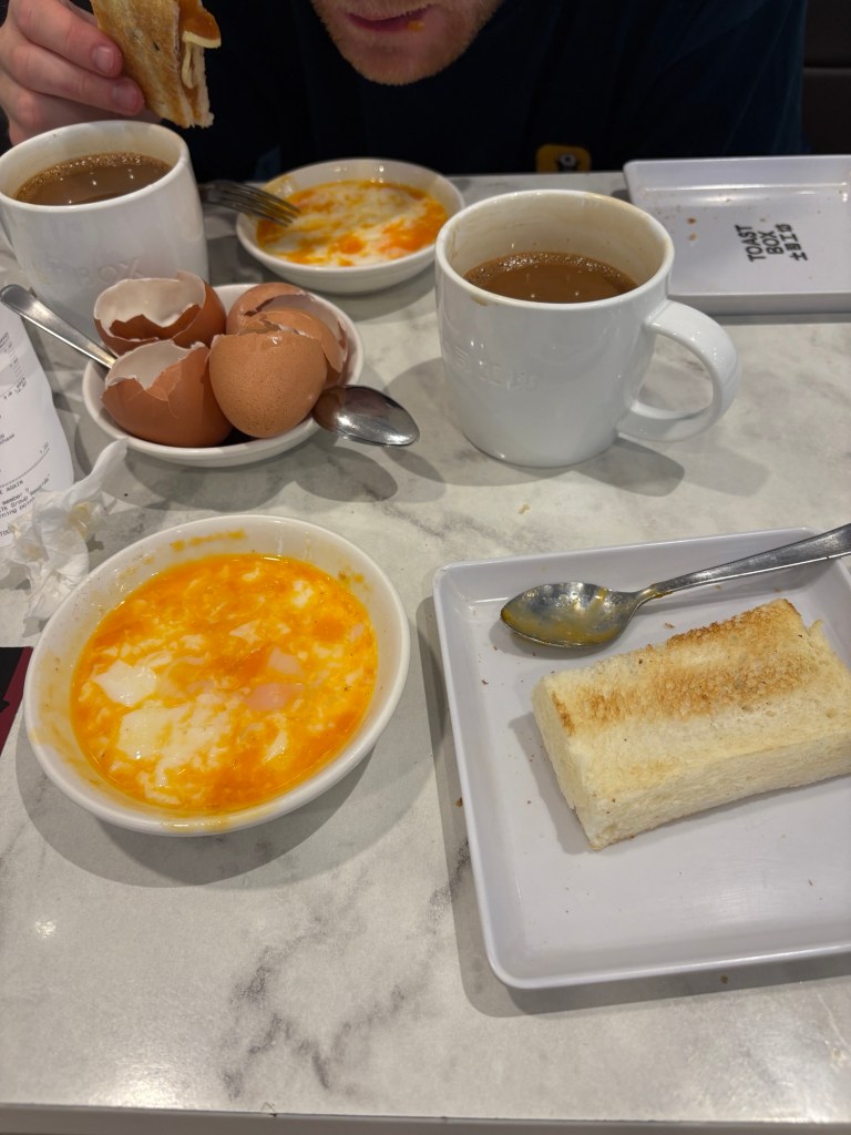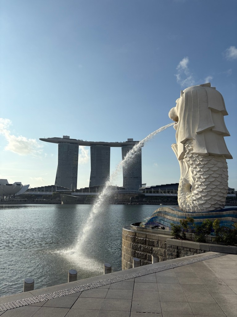 Começamos a caminhar em direção à famosa Marina Bay e fizemos uma parada rápida no Toast Box para experimentar o café da manhã típico dos locais: torrada com kaya, ‘ ovos moles e café (ou kopi, como os locais chamam). Foi diferente, mas delicioso! É difícil descrever a sensação de ver a Marina Bay tomando forma diante dos meus olhos. Queria ver aquilo de perto há tanto tempo, e realmente não me decepcionei. De lá, seguimos para outro clássico de Cingapura: o Merlion.